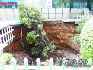 8月9日上午,记者在西固区天鹅湖附近的马路上看到,该处出现了两个不同程度的“天坑”,一个坑直径有三四米,深五六米,坑内散落着一些防护栏和一棵松树。另一个坑直径约一米,深度为一米多。事发路段交通已被临时管制,交警、园林、市政等部门工作人员在现场拉起警戒线,保护过往行人安全。