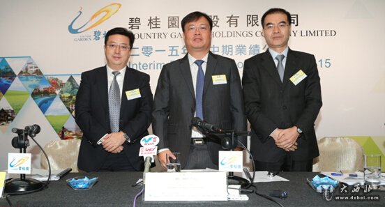 8月19日,碧桂园集团总裁、执行董事莫斌(中),碧桂园集团联席总裁、执行董事朱荣斌(左),碧桂园集团执行董事、首席财务官吴建斌(右)出席碧桂园2015年度中期业绩发布会。