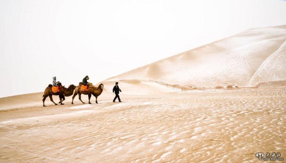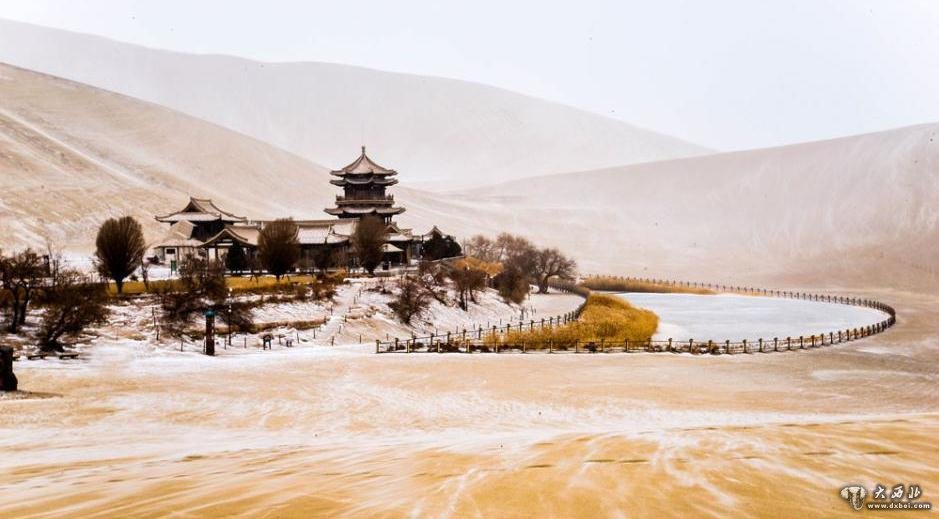 大西北网讯 1月21日,古郡敦煌降下2016年以来的第一场大雪。敦煌山川大地一片银白色的冰雪世界,当地著名的旅游景区鸣沙山月牙泉呈现出雪舞黄沙、沙雪交融的大漠美景,吸引游人前往观赏大漠雪景。