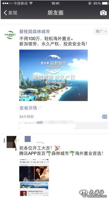 北京时间2015年2月15日开始,碧桂园猴年首个朋友圈广告上线——碧桂园森林城市《不用100万,轻松海外置业》。作为碧桂园海外布局的最高代表作,碧桂园森林城市致力打造新坡坡旁永久产权的投资安全岛。