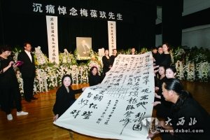 刘秀荣、张春孝两位京剧名家携众弟子祭拜梅葆玖先生,刘秀荣女士哭诉道:“玖哥,您一生为京剧艺术奔波,为传播梅派艺术做出了巨大贡献。我也一定尽我所能将梅派艺术继承、发扬光大。”