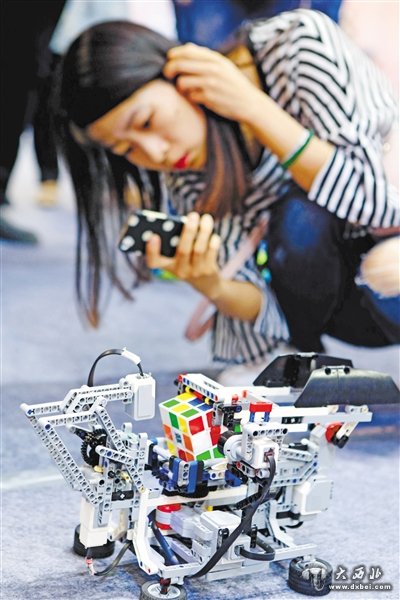 展示区最吸引孩子们的当数各种机器人了。在一台智能机器人前,设计者让参观市民将魔方打乱,然后再放回机器人“手中”。机器人先把“眼睛”凑上来看,在两个像方框一样的手的精妙配合下不到2分钟就还原了魔方。机器人设计者说,其运行原理和大多数人玩魔方时的步骤一致,先用自己的“眼睛”将魔方各个面的色块分布扫描,再根据自身的程序按照魔方公式进行还原。