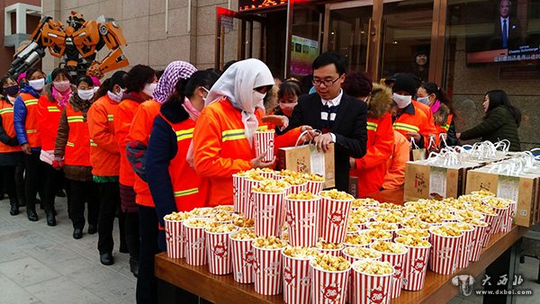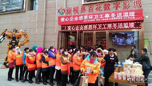 大西北网讯  12月20日上午,由永登新视界百花数字影城主办,丁娃食品、永登康辉旅游、立升净水器协办的爱心企业感恩环卫工寒冬送温暖行动,在永登新视界百花数字影城举行。爱心企业向环卫工人发放了爆米花、玫瑰饼、热饮,并推出免费观看电影服务。永登县环卫工人收到了冬至节前一份爱心浓浓的特别礼物。
