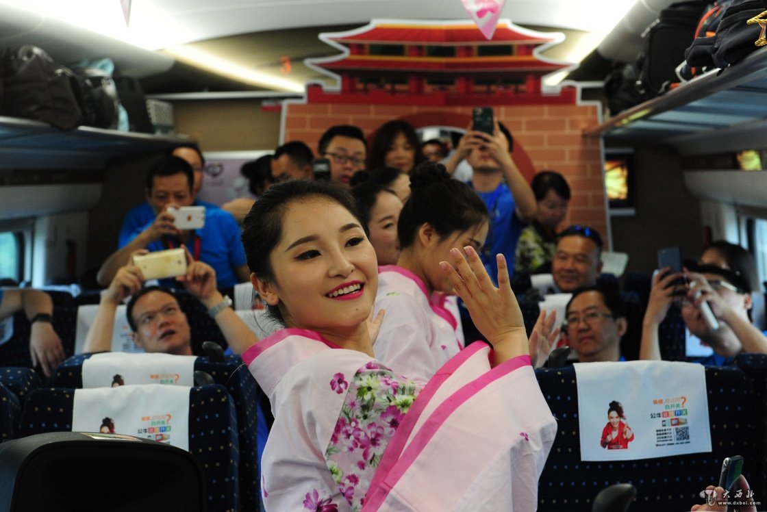 7月9日,列车工作人员在西安北开往兰州西方向的D2685次列车上为旅客表演节目。