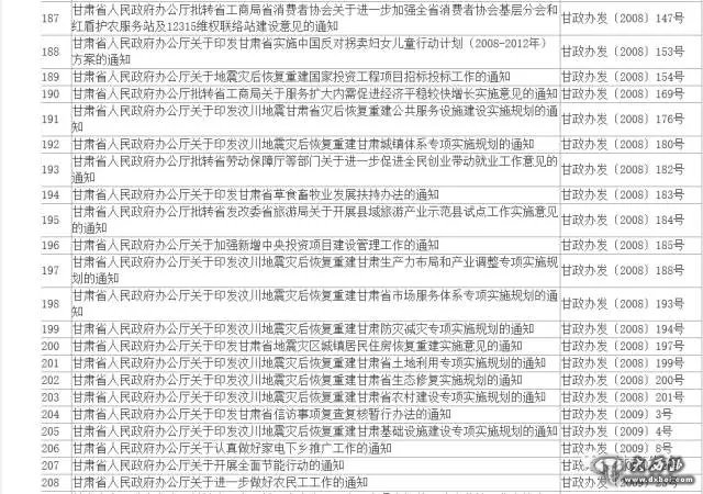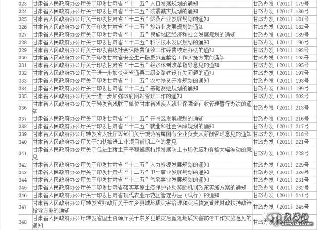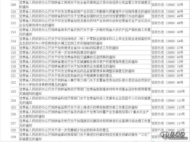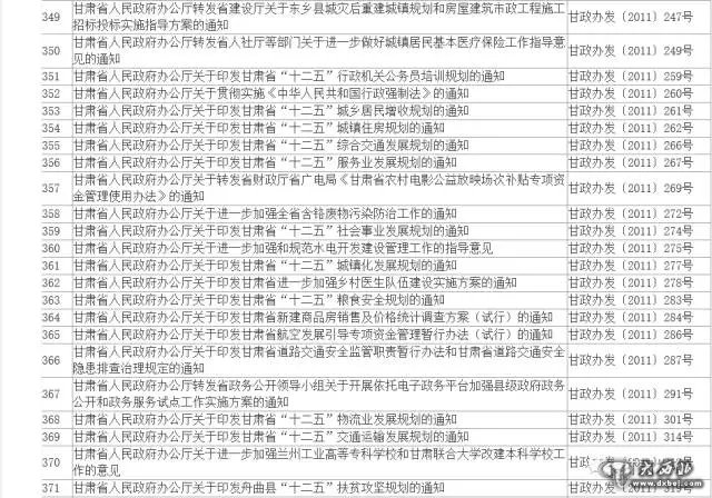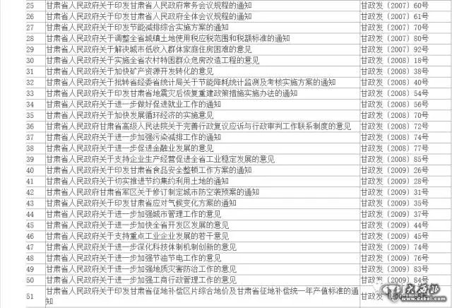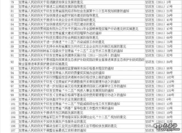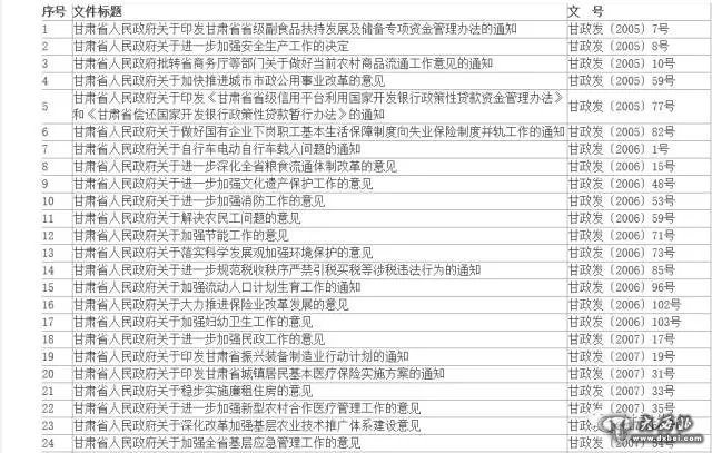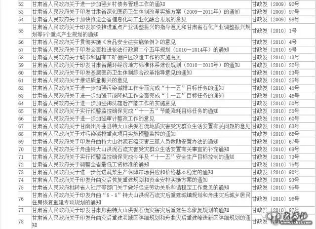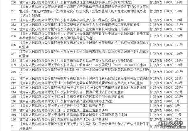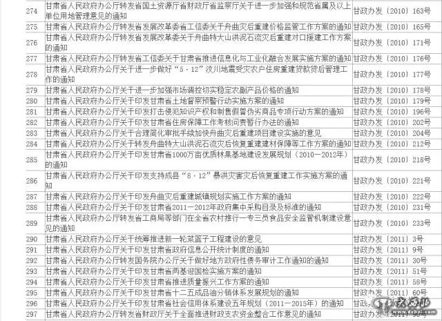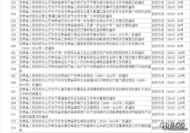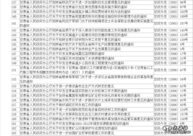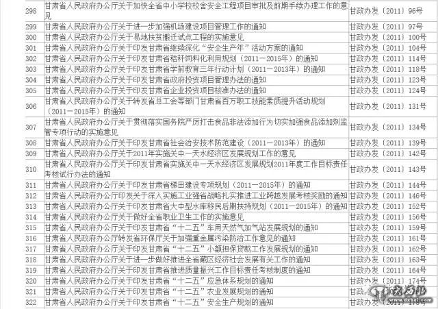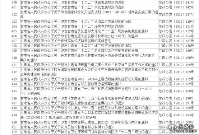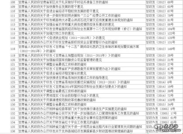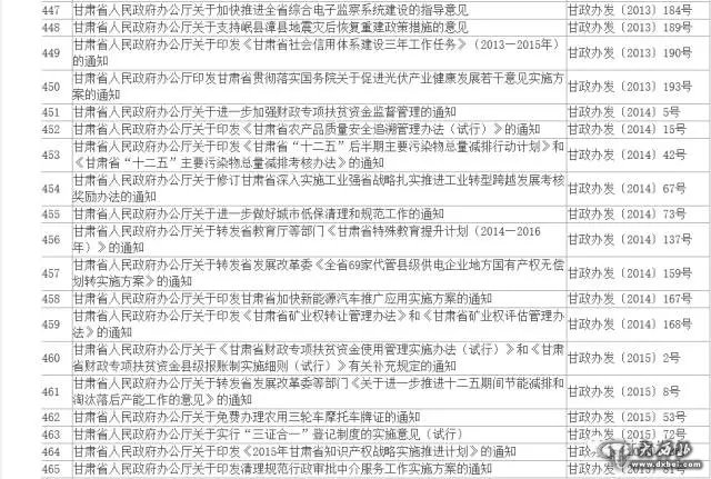 根据国务院相关要求,省政府对2000年1月1日至2015年12月31日期间的文件进行了全面清理。除22件涉密的文件之外,此次宣布失效的共计465件。其中包括:《甘肃省人民政府关于自行车电动自行车载人问题的通知》、《甘肃省人民政府关于加强流动人口计划生育工作的通知》、《甘肃省人民政府关于解决农民工问题的意见》、《甘肃省人民政府关于解决城市低收入群体家庭住房困难的意见》、《甘肃省人民政府关于实施全省农村特困群众危房改造工程的意见》、《甘肃省人民政府关于印发甘肃省城镇居民基本医疗保险实施方案的通知》、《甘肃省人民政府关于稳步实施廉租住房的意见》、《甘肃省人民政府办公厅关于印发甘肃省地震应急预案的通知》等。