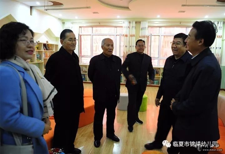 临夏州原人大常委会副主任、临夏州慈善协会会长王天佑(左3)、临夏州原人大常委会副主任、临夏州老科技工作者协会会长马如麒(左4)等州上领导、及临夏市教育局局长李志中(右1),临夏市教育局教育股主任关瑞(左1)在临夏市锦绣幼儿园内参观指导工作。