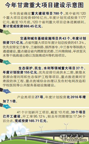 在省列重大项目中,交通和城市基础设施项目共43个,年度计划投资721亿元,占省列重大项目年度计划总投资的61.3%,优先安排宝兰客专、兰渝铁路、银西客专、中兰客专等铁路大通道建设,重点建设省内渭源至武都、兰州南绕城、平凉至天水、景泰至中川机场等干线高速公路以及陇南成州、武威天马、庆阳华池等机场项目。