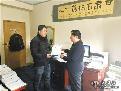 马子禄牛肉面负责人马汀(左)收到日本“马子禄”文字商标登记证。 兰州晨报首席记者 张继培 摄