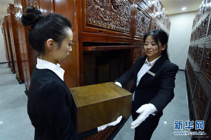 在甘肃天庆博物馆,工作人员整理影印本文渊阁《四库全书》藏书柜(4月20日摄)。
