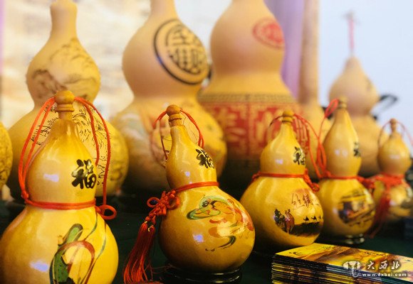临泽旅游精品线路推介会上展示的手工烙画葫芦。新华网发(陈楚培摄)