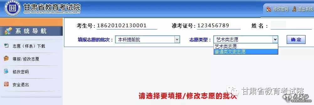 7、志愿提交后,如考生要修改某批次志愿,点击“系统导航”栏中的“填报/修改志愿”选项,选择批次后,使用“志愿提交密码”修改志愿。
