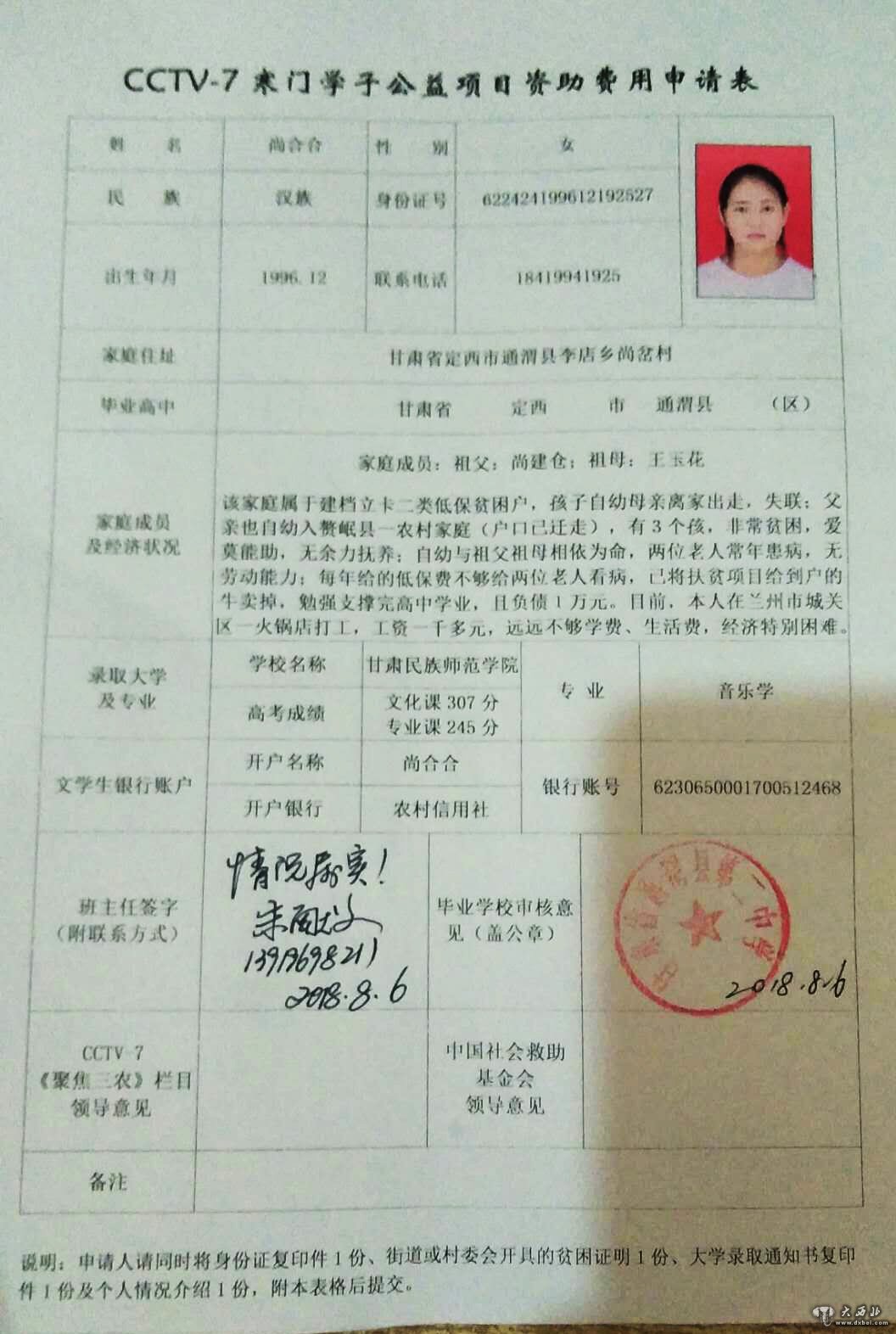 她从小就失去了父母之爱,与爷爷奶奶相依为命。但她却异常的坚强和懂事,因为她有一个梦想,就是想长大当一名老师。因此,她努力,她坚强。甘肃省通渭县李店乡尚岔村后湾社女孩尚合合,今年高考被甘肃民族师范学院音乐专业录取。为了筹集学费,她高考后立即到兰州一家火锅店打工。她为同事和客人带来了优美的歌声,带来了阳光和正能量。