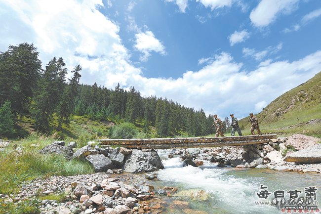 路途中,我们碰到了正在巡山的护林员王金生、李琛和黄晖云。3人身着迷彩服,手持PDA寻呼设备,正在进行林区日常的火情、林木生长、林木伐盗情况的管护和检查工作,据王金生介绍,他们站共有9人,管护的林区面积有100多万亩,每次巡山需要一个星期,每个人要背着30斤重的行李上山。据了解,3个人在大山深处工作的时间都在20年以上,40多天他们才能回城里和妻儿老小团聚一下,王金生说,远离城市、远离家人的生活不苦不累是假,但为了保住绿水青山,他们无怨无悔。朴实的话语道出了众多护林员的心声。陪同采访的祁连山管理局工会主席陈玉平告诉记者,祁连山管理局现有22个林场,有护林员1400多名,他们就像那些耐寒耐旱的青海云杉,顶住低温、高寒等恶劣自然条件的侵袭,耐住远离家人朋友、繁华都市的孤独寂寞,顽强地守护着祁连山,成为祁连山另一道独特的风景。