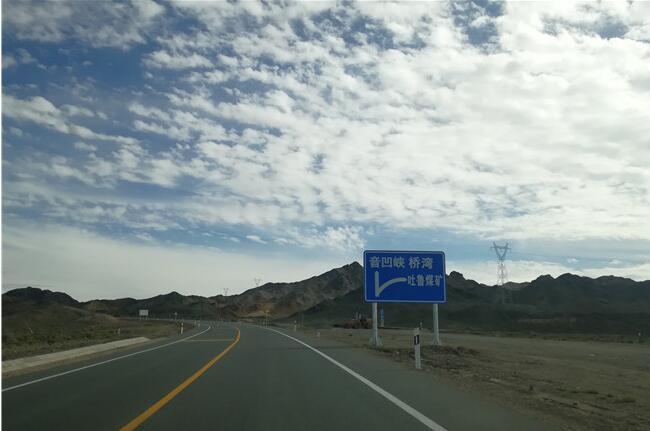 虽然平坦的戈壁和连绵耸立的山脉呈现深黑色,但在戈壁长天和白云低绕的亲抚下,却给人一种少见的雄浑之感。尤其连接桥湾至马鬃山的现代化公路,仿佛是一条蜿蜒伸展在戈壁与山脉间的飘带,为苍茫大地平添一份动感之美。