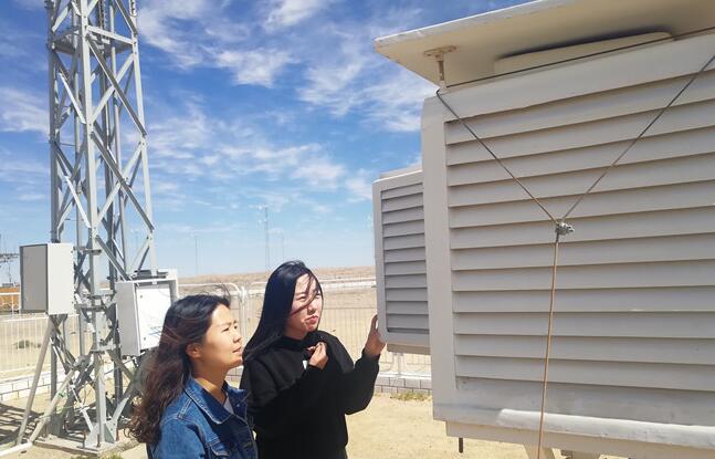 26岁的女孩苏子航和29岁的女孩成静打开百叶箱巡视仪器是否正常。那一刻,大风同时吹起他们的长发和衣领,与百叶箱一起,给人们呈现出戈壁长天下一幅美丽的画面。