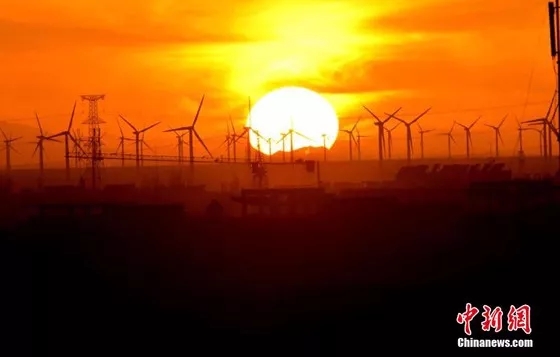 甘肃省玉门市地面风电场的风机与夕阳晚霞相映成趣。万宗平 摄