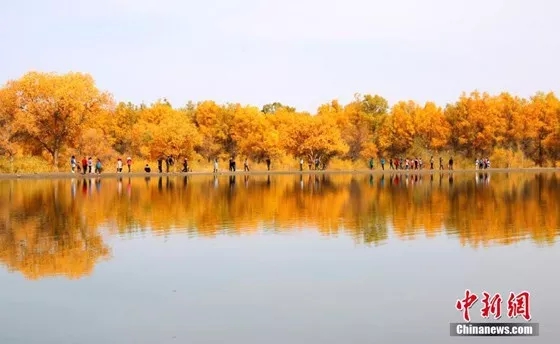 金秋时节,层林尽染的大漠胡杨林美景绽放丝路古道。王斌银 摄
