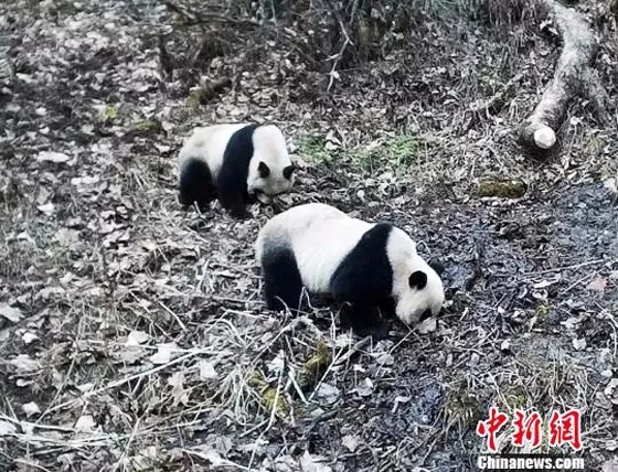 甘肃白水江国家级自然保护区内红外相机拍摄到的野生大熊猫母子。甘肃白水江国家级自然保护区供图