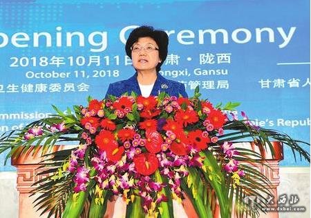 10月11日,全国政协副主席李斌在2018中国(甘肃)中医药产业博览会上致辞并宣布大会开幕。本报记者李小龙