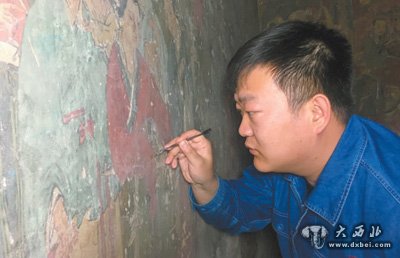李晓洋在修复壁画。资料图片