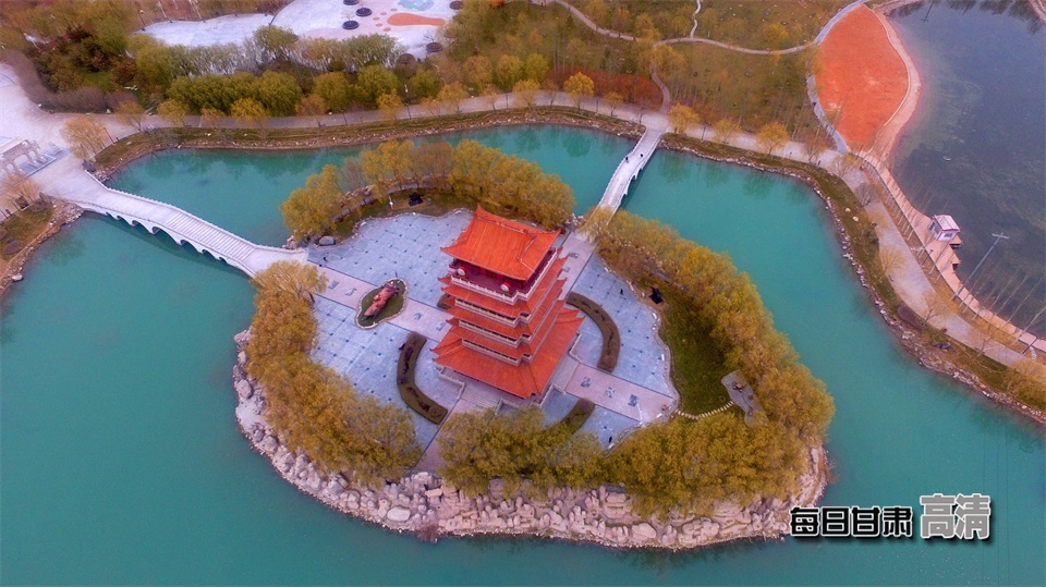 玉门新市区玉泽湖公园。(航拍图)
