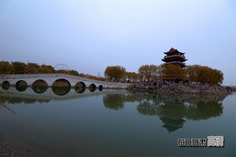 初冬的玉泽湖公园,亭台楼阁倒影水中,美不胜收。