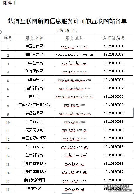 甘肃省互联网信息办公室完成了甘肃中甘网传媒有限责任公司、甘肃日报社、兰州互联网新闻中心3家新闻单位的换发证工作,新审批15家互联网新闻单位。截至2018年11月13日,全省有18家单位获得互联网新闻信息服务许可,分别是:甘肃中甘网传媒有限责任公司、甘肃日报社、兰州互联网新闻中心、甘肃省广播电影电视总台(集团)、酒泉日报社、定西日报社、陇东报社、甘南广播电视台、金昌日报社、平凉日报社、天水日报社、陇南广播电视台、临夏州广播电视台、武威日报社、兰州日报社、兰州广播电视台、嘉峪关日报社、白银电视台。其中,获得采编发布服务许可18家、传播平台服务1家。包括:互联网站18个,应用程序12个,公众账号90个,其他服务形式3个,共计123个服务项。