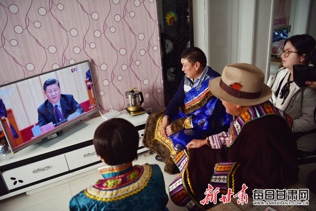 肃南裕固族自治县牧民收看庆祝改革开放40周年大会直播。