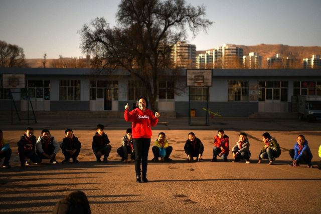 12月17日,在甘肃省渭源县清源镇第一小学,来自福州的支教教师王琦和孩子们做游戏。新华社发(王纲摄)