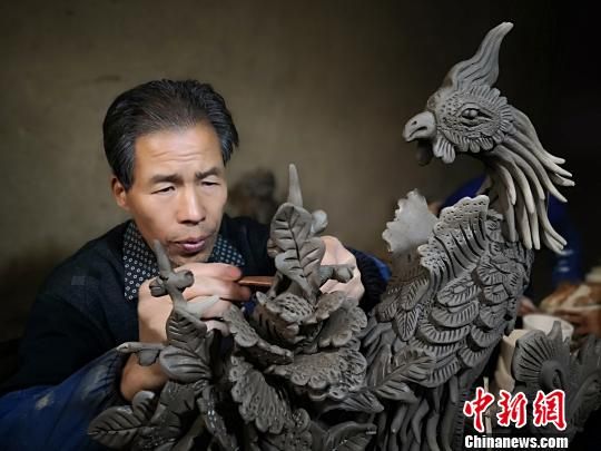 图为刘泉泥塑的作品“凤戏牡丹”。魏建军摄
