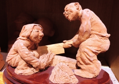 泥塑馆里还展示了一些未经创作的红泥,干透的红泥像石头一样坚硬,用刀子都刮不动。岳云生说:“咱们甘肃省的胶泥特别好,我的展柜中有35年前的作品,没有丝毫损坏。经过反复认真的特殊加工,干透后不裂口、不变形,可永久收藏。麦积山石窟泥塑1600年了,敦煌莫高窟泥塑1400年了,它们在石窟中历经千年沧桑,应对自然气候变化,至今大都完好,断臂断耳大都是人为磕碰所致。”泥塑不像陶瓷一样易碎,将千年流淌的岁月定格在一尊尊泥塑上,把那千年的风华定格成了隽永。岳云生拿出了几件几十年前的作品,表面形成了自然的旧皮、包浆,更显沧桑韵味。