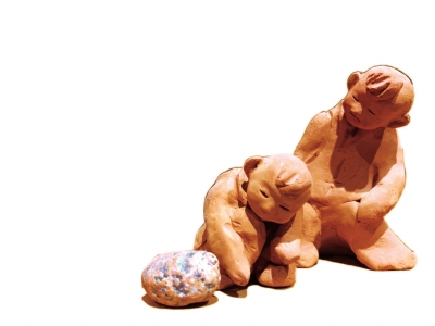 “年”系列是岳云生泥塑中最为温馨、欢乐的一组作品,这一组泥塑的每个情景中,大多数都有两个小人儿,一个是三四岁的岳云生,另一个是稍长几岁的姐姐,两个小人儿憨态可掬,调皮灵动。年初一,换新衣,岳云生的母亲为姐弟俩换上了新衣服,杀年猪,祭祖,给压岁钱,放鞭炮,再现了上世纪50年代热闹的过年场景。