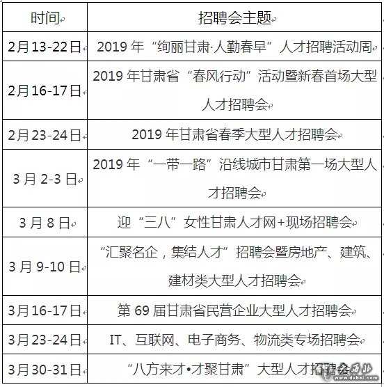 为满足广大求职者与企事业单位春节过后的求职及招聘需求,甘肃省人力资源市场(甘肃省高新技术人才市场)定于2019年2月13日至3月31日期间举办甘肃省春节后系列人才招聘活动。