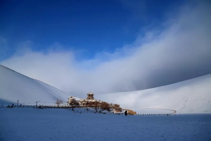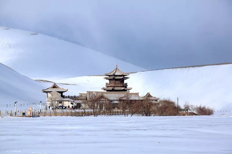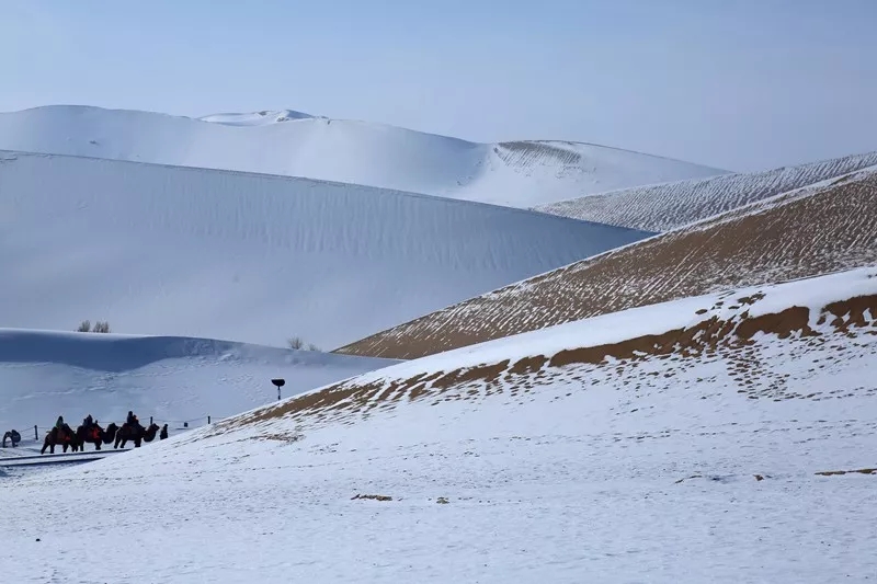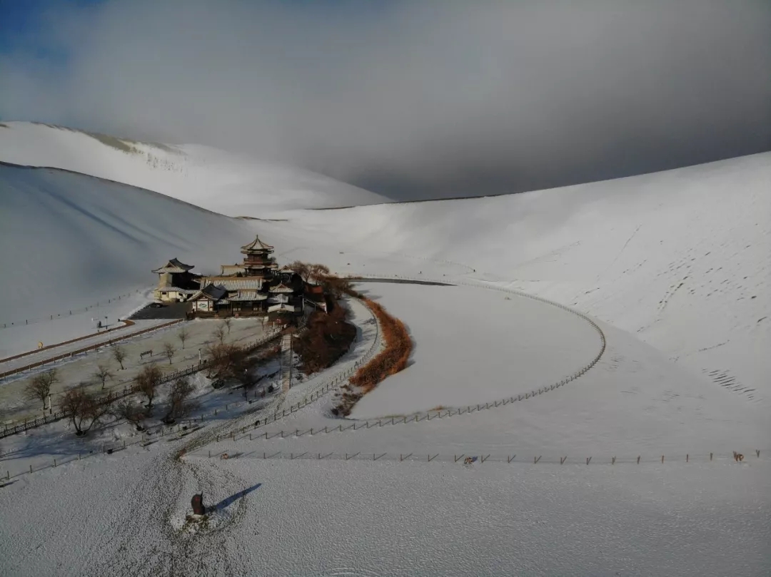雪后的敦煌市鸣沙山月牙泉景区银装素裹,景色如画,吸引不少游客前来欣赏大漠雪景,体验丝路风情。