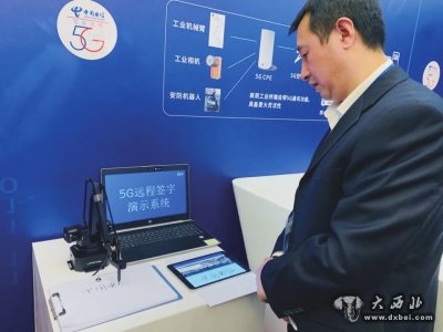 领导出差或在高铁上,但公司的文件需要签字,怎么办?在5G远程签字系统前,此类问题将迎刃而解。工作人员向记者介绍,这是一套基于5G低时延、大带宽的远程签字演示系统,如果办公室配备了该设备,利用一部手机就可以实现远程签字。工作人员现场演示在手机上签字,远程的机械臂就会签出同样内容的文字。它的应用将大大提高企业的运行效率。
