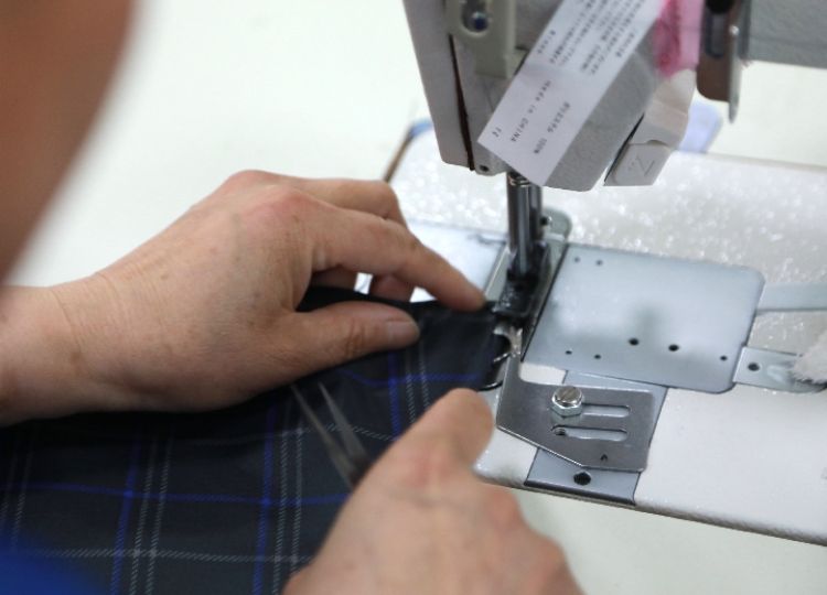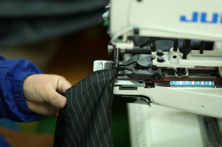 4月3日,在东乡族自治县振兴雨具扶贫车间,工人使用缝纫机加工雨伞伞面。