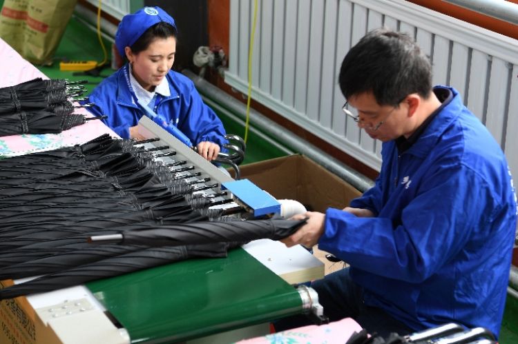 4月3日,在东乡族自治县振兴雨具扶贫车间,工人安装雨伞伞把。新华社记者范培珅摄