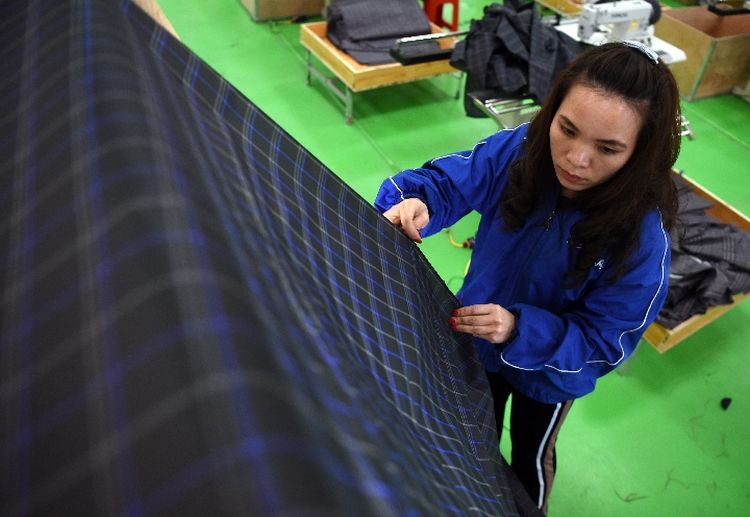 4月3日,在东乡族自治县振兴雨具扶贫车间,工人剪裁雨伞伞面材料。新华社记者刘洁摄