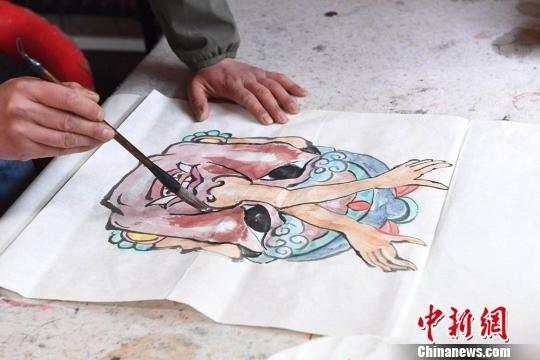 甘肃兰州城边,一处不起眼的房屋内挂着一排面目狰狞的傩面具,甘肃民间手艺人马正德端详片刻后,返回工作台前,对此前的图稿进行补色,在此后一段时间内,将在木料上呈现出一张张栩栩如生的傩面具。