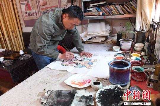 甘肃民间艺人马正德对图稿进行补色。