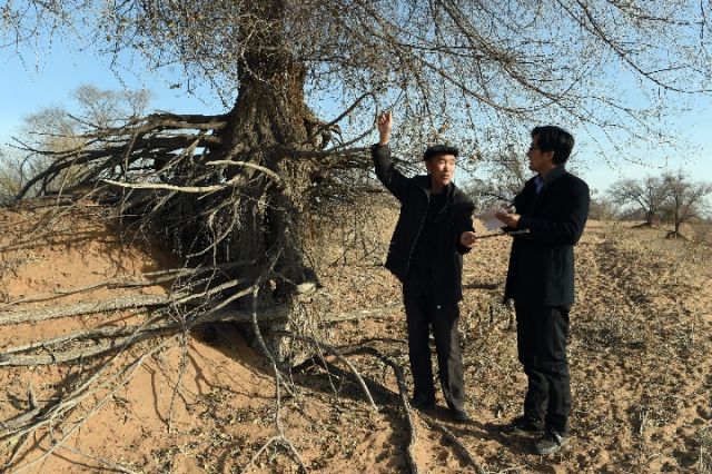 在古浪县八步沙林场,郭万刚(左)向林业部门工作人员介绍风沙造成树根裸露的情况。新华社记者 范培珅 摄(资料图片)