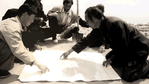 前图为新华社2001年5月21日播发的新华社记者韩传号拍摄的六老汉之一张润元(右一)等人研究八步沙规划图;后图为八步沙第二代治沙人研究八步沙地图(新华社记者 范培珅 摄)。