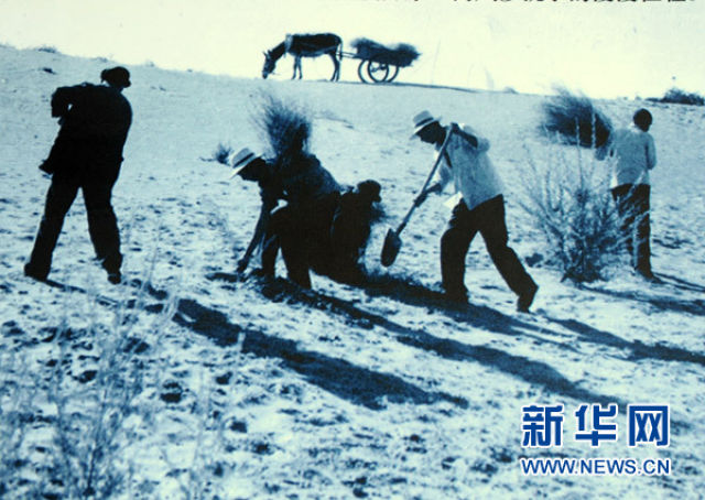 这是上世纪80年代古浪六老汉在八步沙治沙的场景(资料照片)。 新华社记者 聂建江 摄