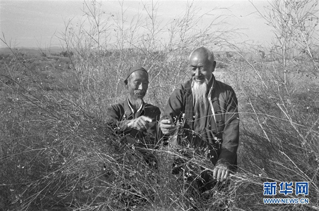 90年代初,石满(左)、贺发林(右)在八步沙治沙造林(资料照片)。新华社记者 李生才 摄