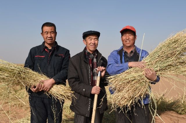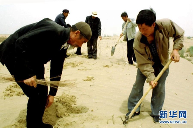 在古浪县黄花滩生态移民新区进行生态整治的郭万刚(中)、石银山(右)和罗兴全。新华社记者 范培珅 摄(资料图片)