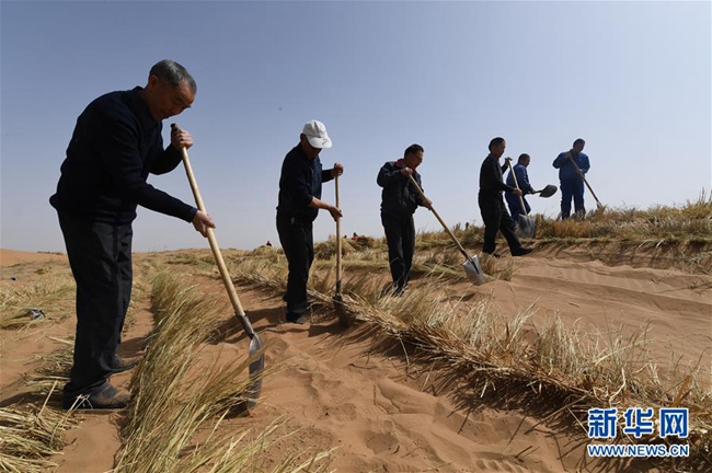 在甘肃省古浪县境内的黑岗沙风沙口,八步沙第二代治沙人用稻草压沙(3月26日摄)。新华社记者范培珅 摄