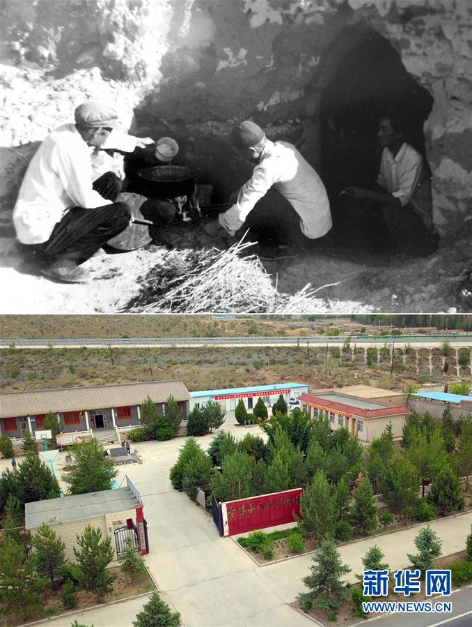 拼版照片:上图为当年六老汉在所住的地窝子前生火做饭(资料照片);下图为如今八步沙林场的院子(新华社记者 范培珅 摄)。