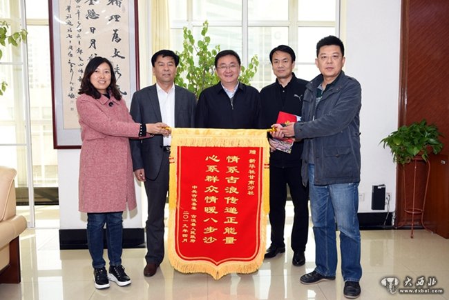 3月底,“八步沙六老汉三代人”治沙群体被中宣部授予“时代楷模”称号。4月15日下午,武威市委宣传部及古浪县委宣传部一行向新华社甘肃分社赠送锦旗,感谢新华社甘肃分社为报道古浪县治沙先进典型“八步沙六老汉三代人”所做的贡献。