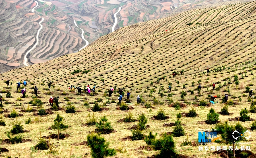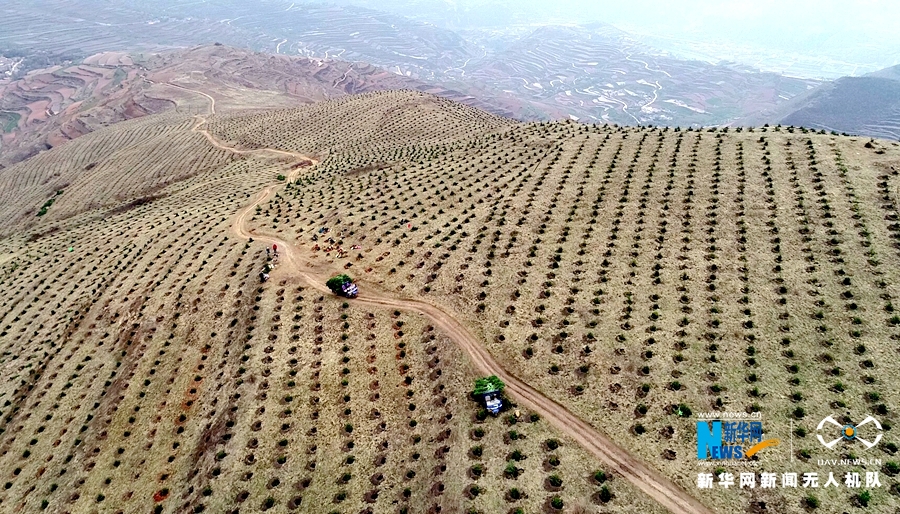 图为航拍镜头下的渭源县峡城乡脱甲山植树场景。新华网发 (李军 摄)