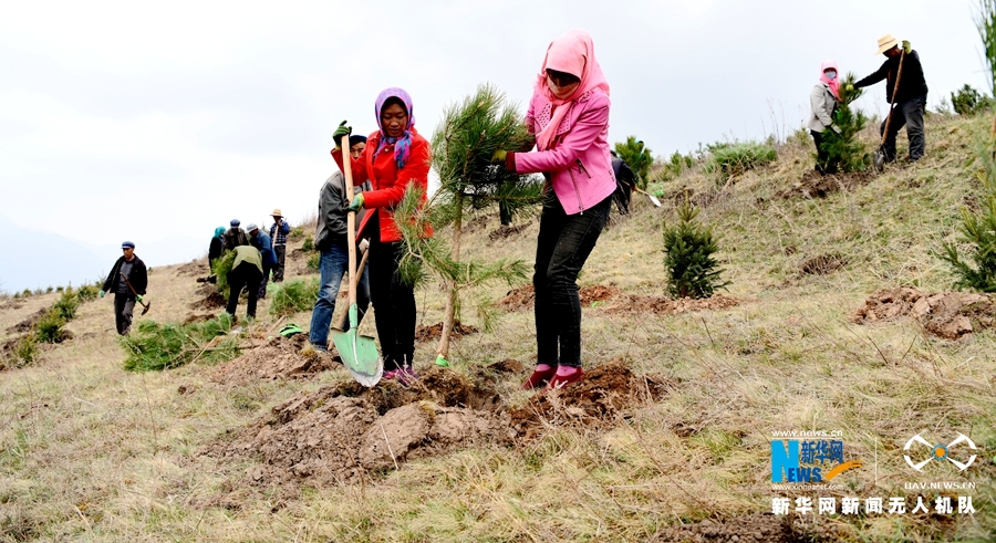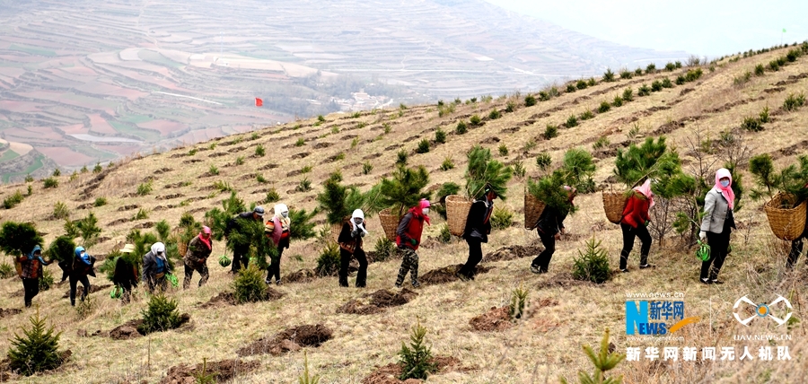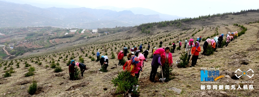 图为渭源县峡城乡脱甲山植树场景。新华网发 (王纲 摄)